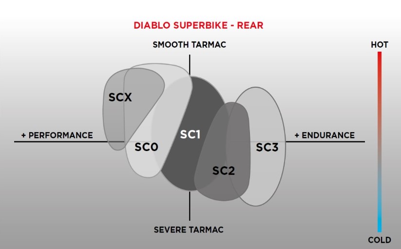 Pirelli Diablo Superbike dostępna jest w 3 wariantach mieszanki przedniej (SC1, SC2, SC3) oraz 6 tylnych (SC0, SC1, SC2, SC3, SCQ, SCX)